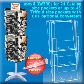 An ideal way to organize and effectively display all your literature at any Point Of Sale site, this floor standing brochure rack utilizes our optional CD1 pocket converters so you can convert any one, or all of the catalog sized brochure pockets (9-1/8") to 2 side-by-side trifold sized brochure pockets (4-3/8").