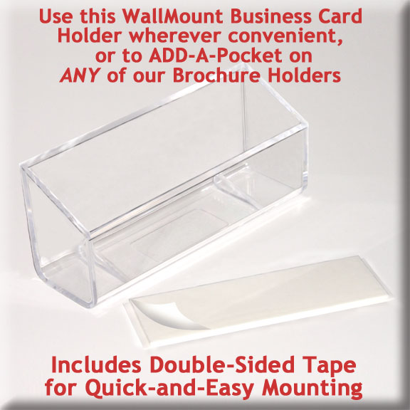 This sparkling clear molded Business Card Holder comes complete with double sided tape, and easily attaches to any clean wall or cabinet surface, or attach it to any of our WallMount or CounterTop literature holders - and because you attach it yourself, it can be placed so as not to interfere with any vital elements of your literature design.