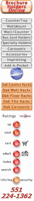This oak and acrylic rotating carousels is the perfect way to display your literature and magazines with style. The crystal clear acrylic front panels hold literature neatly in place and allow for an unobstructed view. Pockets are 9" wide x 2" deep and are easily converted - with removable dividers - for displaying up to 4-1/4" wide brochures. This 12 magazine or up to 24 brochure pocket carousel includes a sturdy oak floor stand with tough, brass toned protective strips.