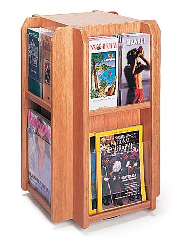 This Solid Oak and Acrylic, CounterTop Carousel is the perfect way to display your Magazines and/or Literature with luxurious style! Comes fully assembled and includes 8 removable dividers so each - or all - of the magazine size pockets can be converted into two 4-1/4" trifold brochure holders.