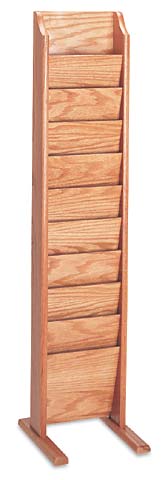 Unique overlapping design displays and organizes magazines and literature, keeping them tidy and visible in the least amount of space. Floor racks are constructed of 3/4" solid oak sides, with genuine oak veneer dividers and backs, and finished with a durable, state-of-the-art multi-coat process. The pockets are 9" wide by 3/4" deep and hold standard 8-1/2" x 11" magazines and literature. Floor stand units are easy to move when rearranging furniture. Screwdriver required to attach feet to literature rack.