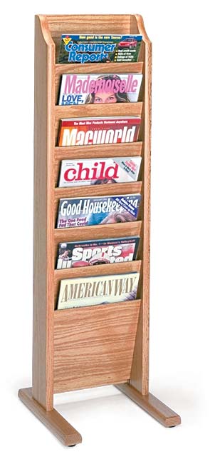 Unique overlapping design displays and organizes magazines and literature, keeping them tidy and visible in the least amount of space. Floor racks are constructed of 3/4" solid oak sides, with genuine oak veneer dividers and backs, and finished with a durable, state-of-the-art multi-coat process. The pockets are 9" wide by 3/4" deep and hold standard 8 1/2" x 11" magazines and literature. Floor stand units are easy to move when rearranging furniture. Screwdriver required to attach feet to literature rack,