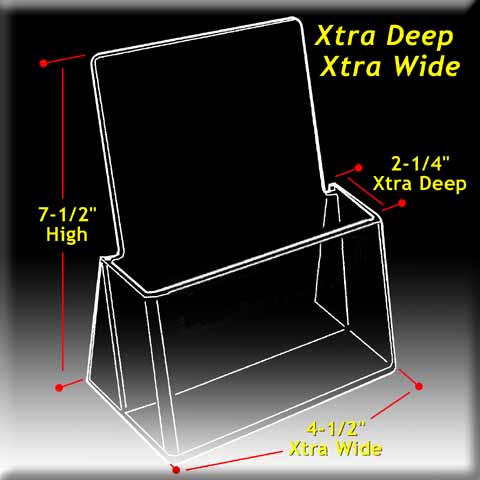 This hard to find Xtra Wide Trifold Brochure Holder is specifically made to accomadate oversized trifold brochures. Plus, the Xtra Deep pocket is well suited for displaying more of the thick items like maps and booklets. It's also ideal for displaying popular trifolds because the Xtra deep pocket minimizes your re-filling chore.